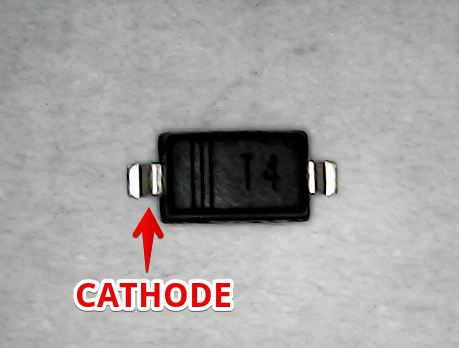 A line identifies the diode’s cathode. You might need a magnifying glass to see it. You can also use the multimeter to check the correct orientation.