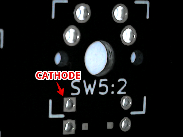The three switches on the first column of the right side should have the T1 LEDs assembled to them. Remember that LEDs are diodes and have an orientation, the cathode (shorter leg) of the LED should be soldered on the square pad.